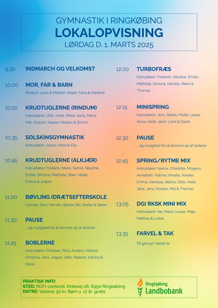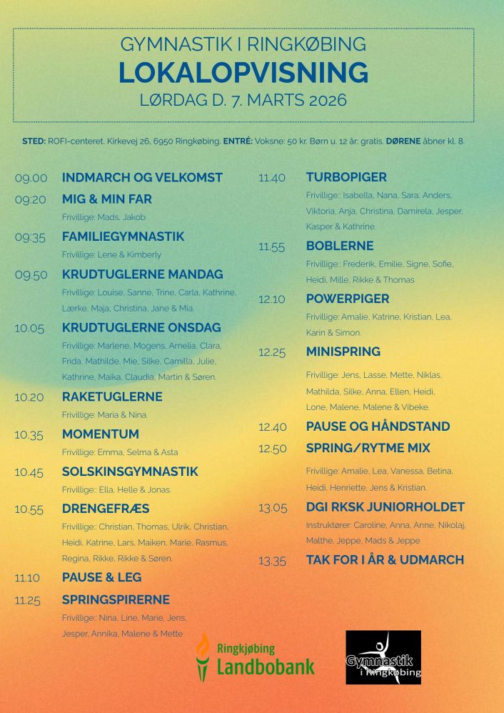 Tag familie, venner og naboer med i hallen til en festlig dag i gymnastikkens tegn, hvor vores hold glæder sig til at vise, hvad de har arbejdet med i løbet af sæsonen.